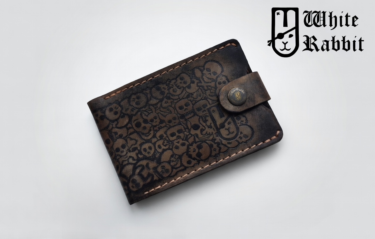 Зажим White Rabbit "Черепа" - для тех, кто не боится выделяться. Полноценная натуральная телячья кожа тёмно-коричневого цвета с глубокой патиной, плотное многослойное тиснение хаотичными черепами и кроликом в стиле old school. Клапан на надёжной кнопке с нашей фирменной гравировкой, контрастная прошивка вощёной нитью в цвет апельсиновой кожуры. Внутри - карманы под карты и купюры, компактный размер (идеально ложится в карман джинсов или куртки). Ручная окраска кромок, каждое изделие уникально из-за естественной текстуры кожи. Лимитированная серия - не для всех, только для своих.